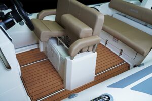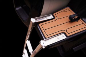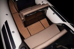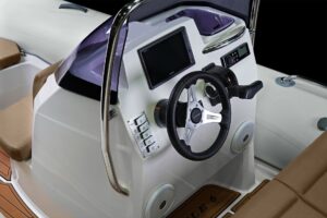 Sporty at heart but refined in detail, this RIB includes a central navigation mast that doubles as a ski tow post—perfect for wakeboarding or waterskiing on the fly. Anti-slip foot pads and thoughtfully placed grab rails enhance safety without compromising the boat’s sleek aesthetic.