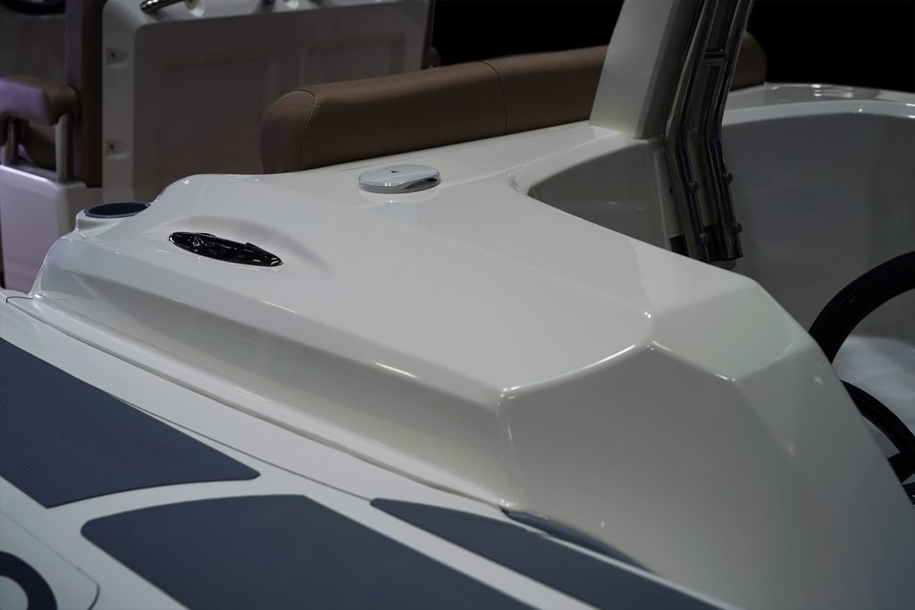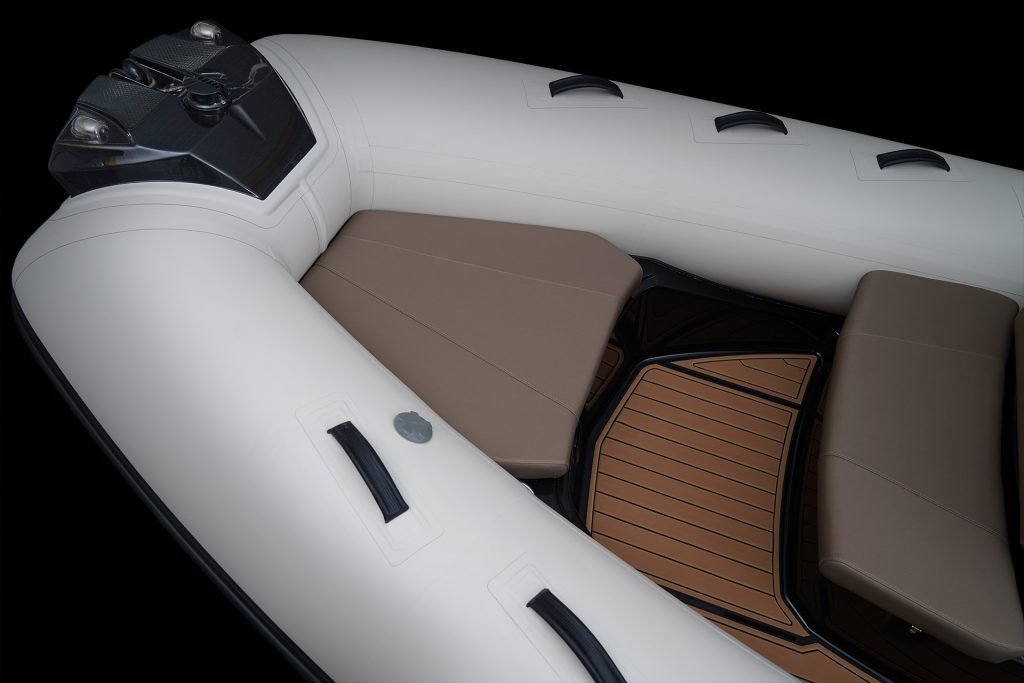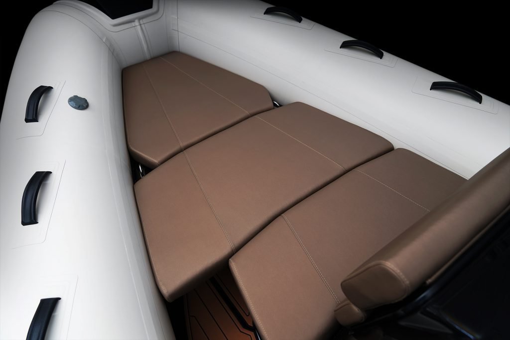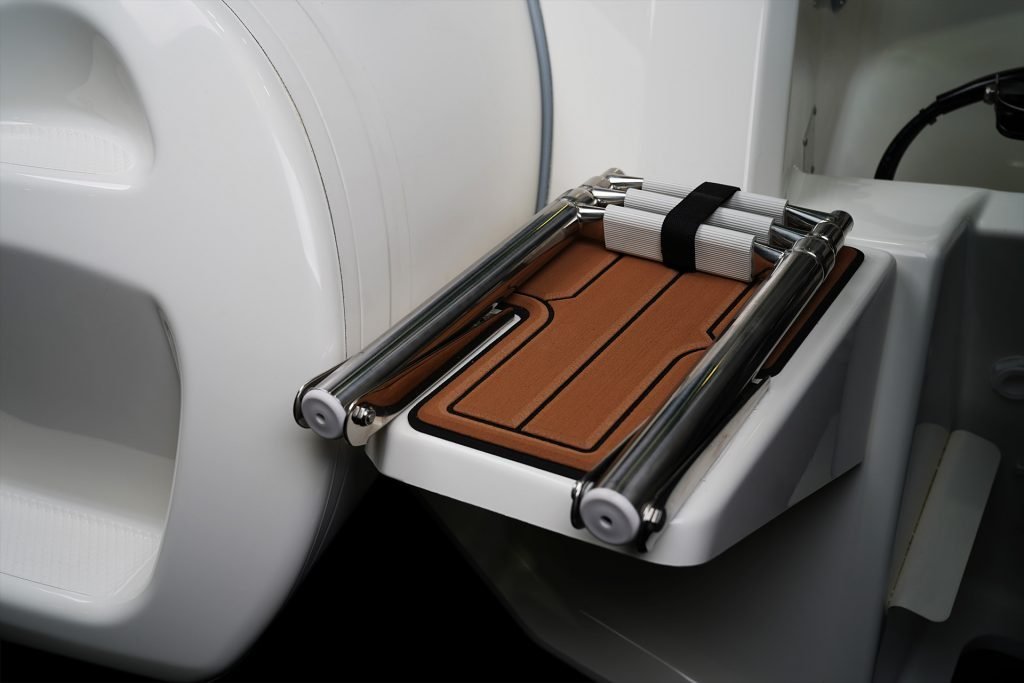Sporty at heart but refined in detail, this RIB includes a central navigation mast that doubles as a ski tow post—perfect for wakeboarding or waterskiing on the fly. Anti-slip foot pads and thoughtfully placed grab rails enhance safety without compromising the boat’s sleek aesthetic.