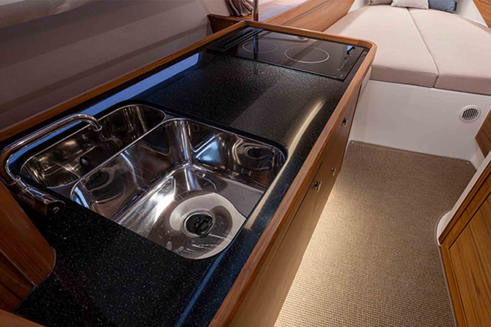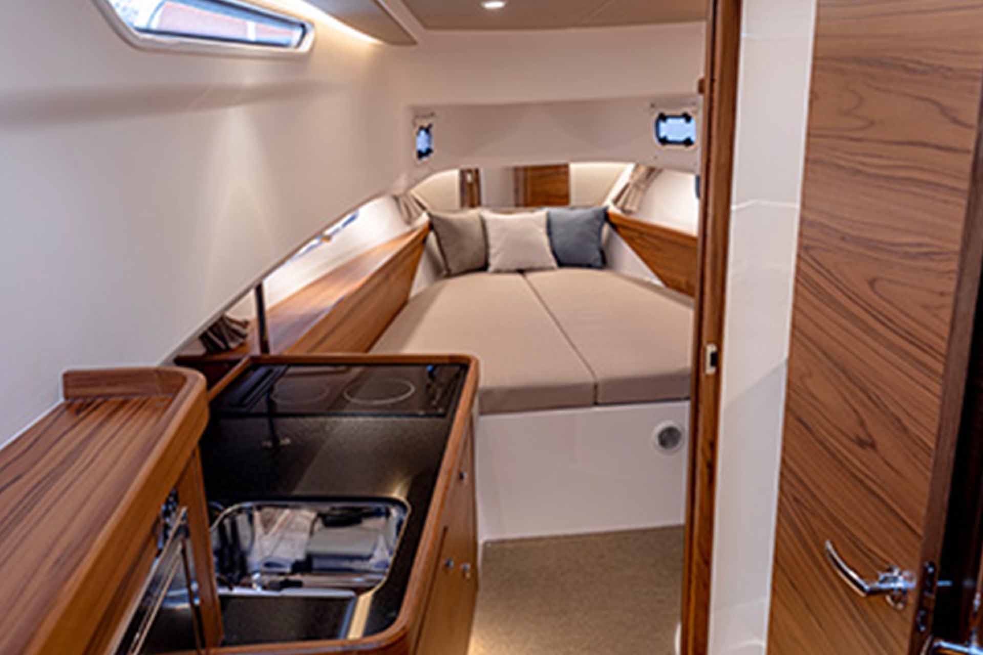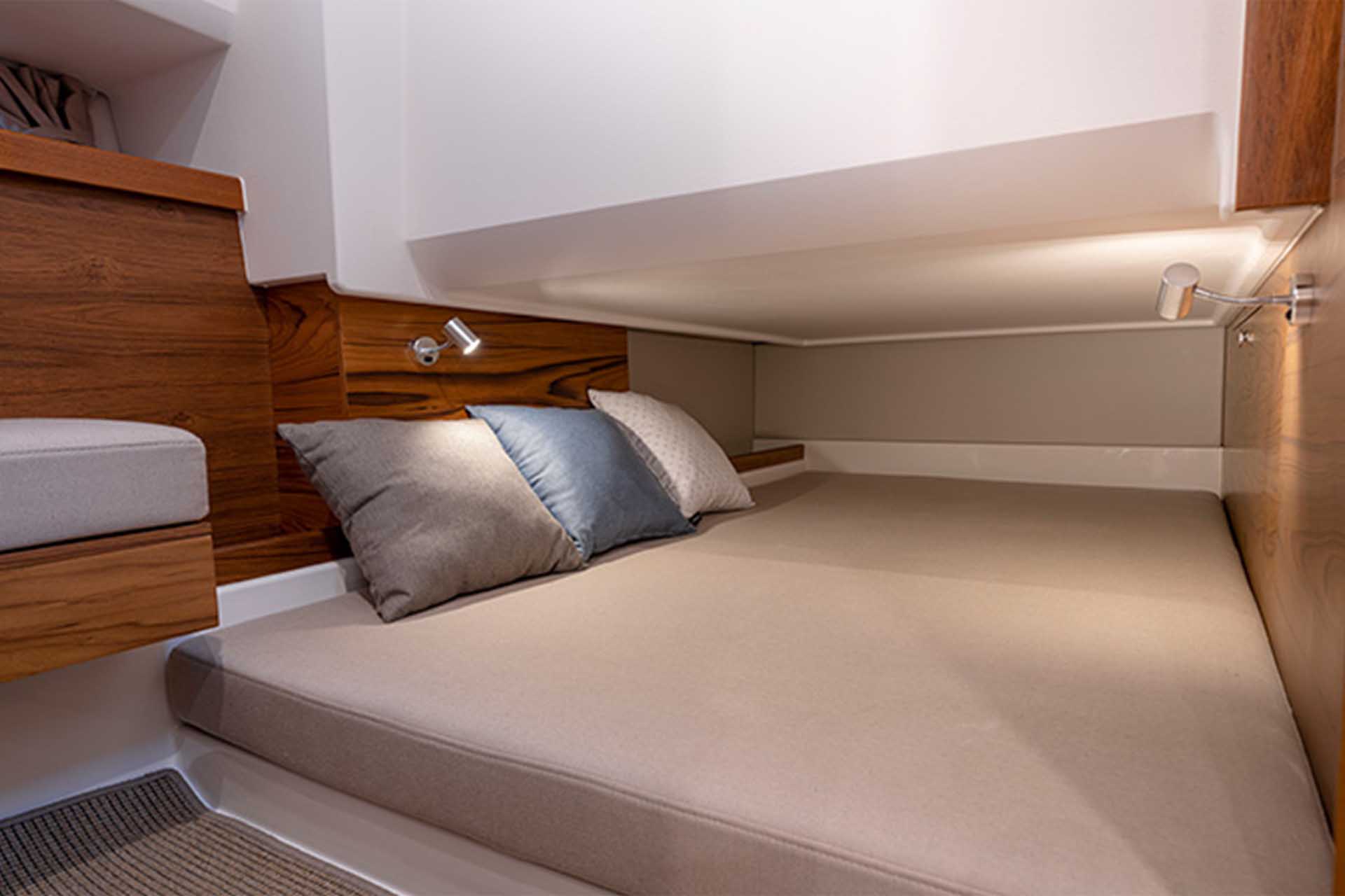 Adjustable amenities allow you to customize the Nimbus C11 to fit your day-to-day needs. The spacious saloon provides foldable sofas that transform easily into transport seating, a u-shaped couch, or a cozy dinette. The Nimbus Commuter 11's comforts continue below deck with front and mid cabins featuring double beds as well as a separate head with a shower and a fully equipped galley.